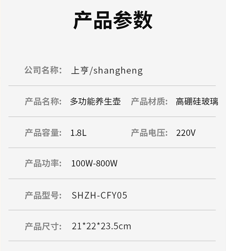 代发上亨养生壶SHZH-CFY05不带滤网1.8L白色
