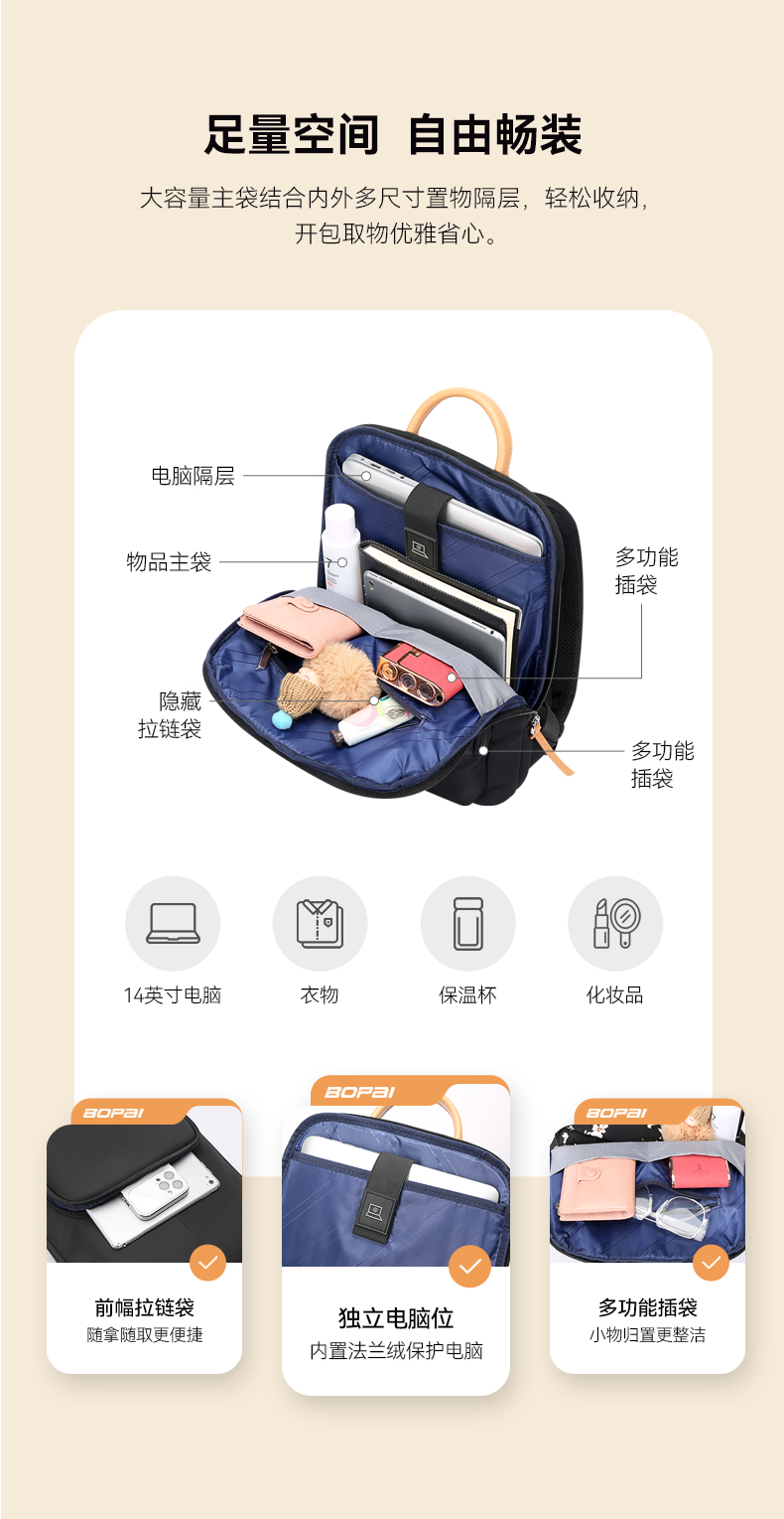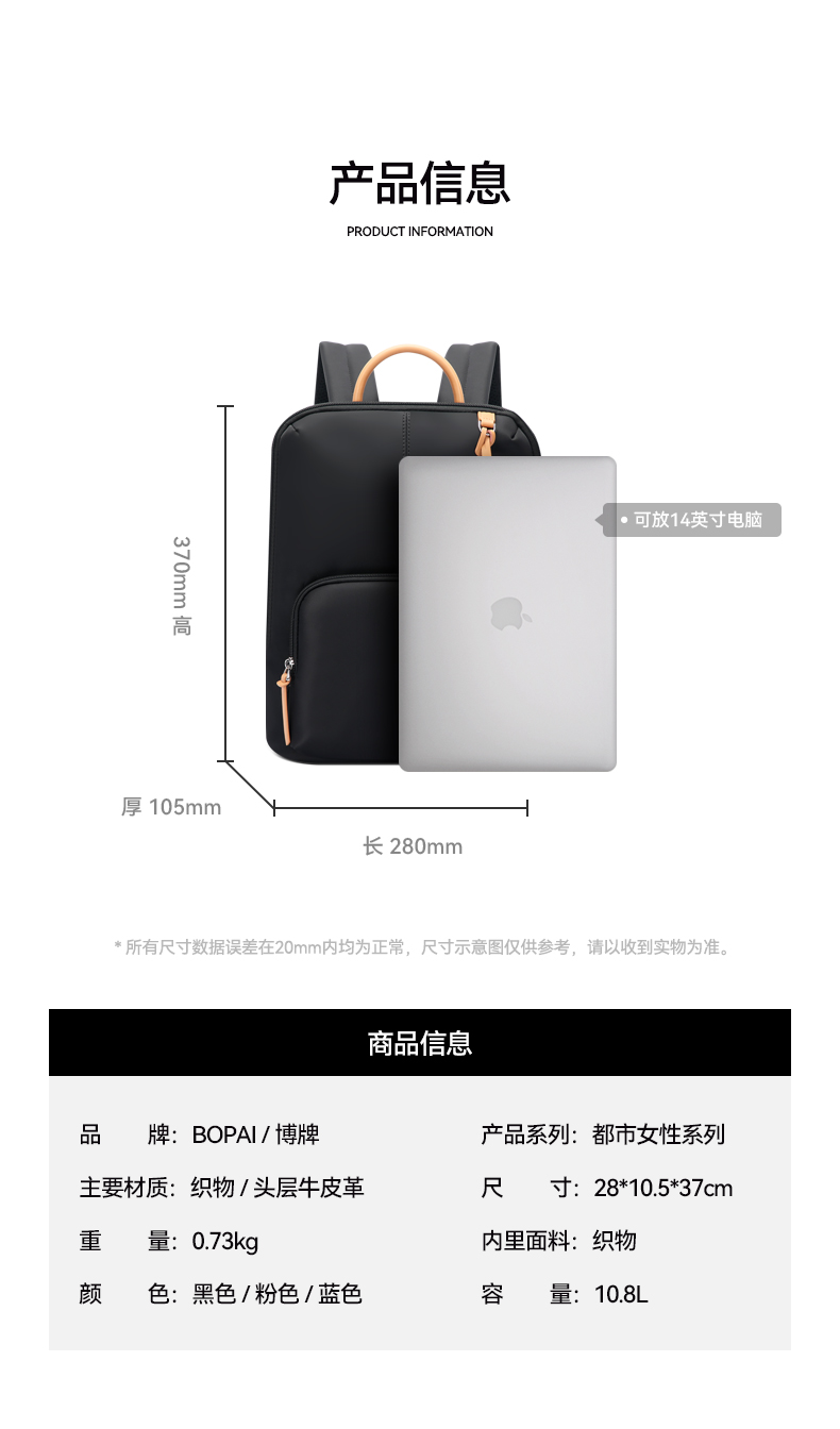代发博牌双肩电脑包女14英寸笔记本苹果背包旅行出差书包62-126521